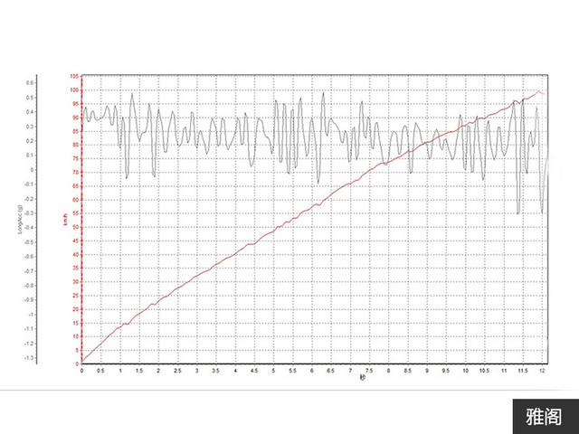 雅阁的刹车力度也相对比较均匀,最大G值出现在刹车后段,最终测得100km/h-0刹车成绩为40.5米。