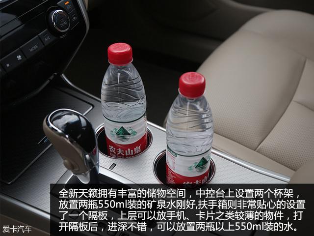 全新天籁手套箱的储物空间也十分出色,前车门、后车门上都设置有进深不错的储物空间,后排扶手上带有两个杯架。
