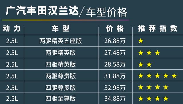 通过上图我们对各配置性价比的分析可以看出,全新汉兰达的中高配车型是比较值得推荐的,最低配车型反而并没有那么值得推荐给大家。下面,我们就来详细分析一下全新汉兰达各个配置之间的差异和性价比。