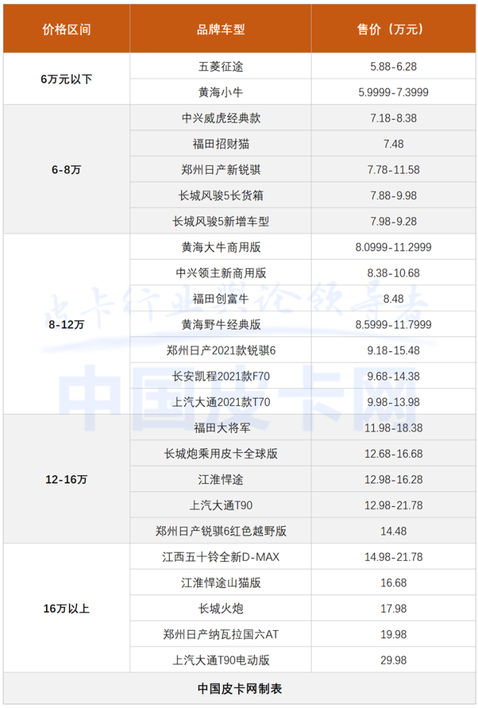 从新车采用的动力形式来看,仅提供汽油动力的皮卡产品有5款,除了主打玩乐性质的长城火炮之外,其他基本都是低价实用的工具型产品;仅提供柴油动力的皮卡产品有10款,以郑州日产、江西五十铃、上汽大通为代表的品牌更偏爱柴油动力;汽柴油动力兼备的皮卡产品有8款,2.0T汽油+2.0T柴油/2.5T柴油是多家车企喜爱的黄金搭配,福田、江淮、长安凯程、黄海等均提供多种动力选择。此外,上汽大通还推出了一款T90电动皮卡,最近几年,随着环保压力的升级,新能源动力成为许多车企的研究方向,但由于售价偏高,目前尚未能打开市场。