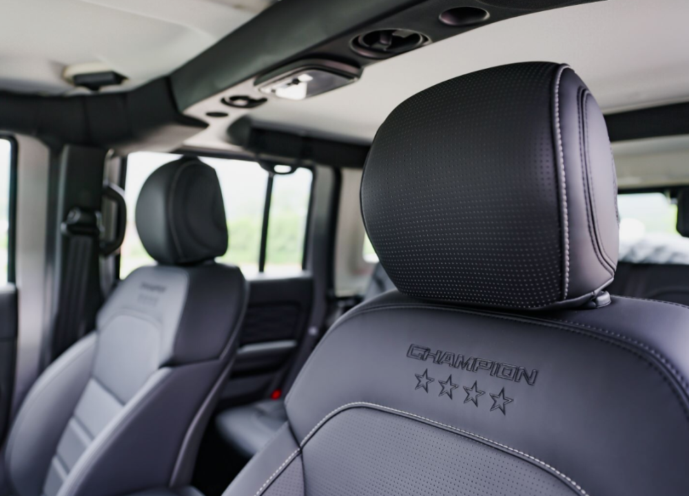 那么这款车到底有哪些地方是值得我们去追捧的,首先除了冠军品质外,它在外观的设计方面就很有特色,首先前脸采用的是矩形方格性的进气格栅,熏黑的处理增添了很深的运动气息,结合上小圆形的灯带点缀,真的看起来就很漂亮。设计来到车身,方正化的车身造型很硬派,并且这款车的前100名预定者,还可以获得苏绣大师亲自绣制的专业限量跑鞋,结合可自主选择冠军专属涂漆和靓号,以及专属拉花、冠军标徽等等,真的可以说是每一辆都独一无二。并且为了提供给你更好的可玩性,这款车还有一个可拆卸式的的天窗,这个是和牧马人很相似的。设计来到尾部,这款车悬挂式的备胎结合上与前进气格栅相似的尾灯,我个人觉得真是很漂亮,很有越野车的气场。在车身尺寸上现在还不得而知,但我觉得应该是和普通版的车型相差不大吧。