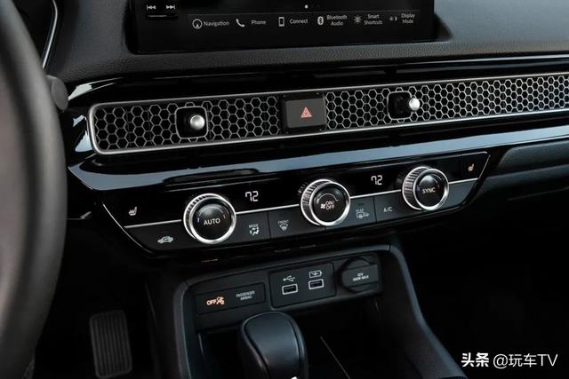 下方以类似网格状设计贯穿整个中控台,并将空调出风口开关进行复古的拨杆式设计。