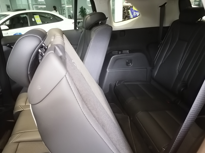 尽管这辆车子是一辆七座的SUV,但是销售员在和我介绍的过程中闭口不谈第三排的座椅乘坐舒适度,所以我在这里早就有了心理准备。这辆车子的第三排进入方式是将第二排座椅靠背拉倒进入,进入的时候是比较憋屈的。再看一下第三排的座椅,确实相当的紧凑,成年人根本就很难进入。