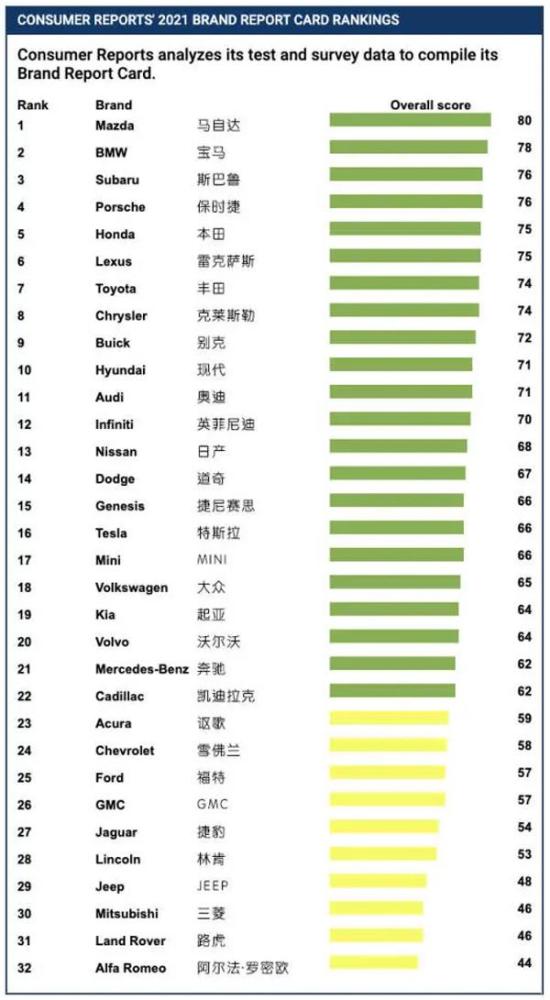 从第一名到第十名,高到低分别为马自达,宝马,斯巴鲁,保时捷,本田,雷克萨斯,丰田,克莱斯勒,别克,现代。
