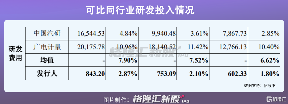 报告期内,公司研发投入分别为602万元、753万元和843万元,分别占比营收的 1.80%、2.10%和 2.87%。与可比同行业的中国汽研和广电计量相较之下,公司研发投入占比偏低,还将继续扩大研发投入,加强技术积累,以提升服务能力。
