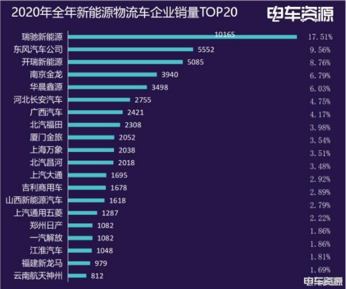 2020年全年新能源物流车企业销量排行 来源:电车资源