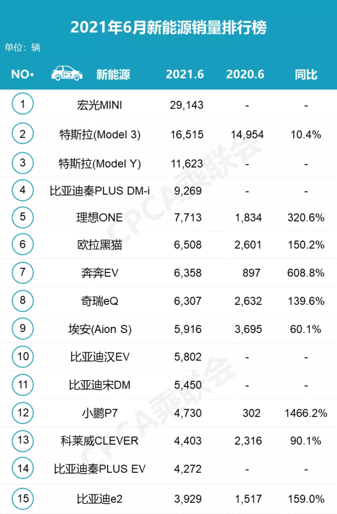 结合新能源销量榜单上其他车型来看,6月份同比上涨最低的埃安S增长幅度为60.1%;势头最猛的奔奔EV上涨幅度为608.8%,虽整体销量低于特斯拉,但增长幅度极为可观。