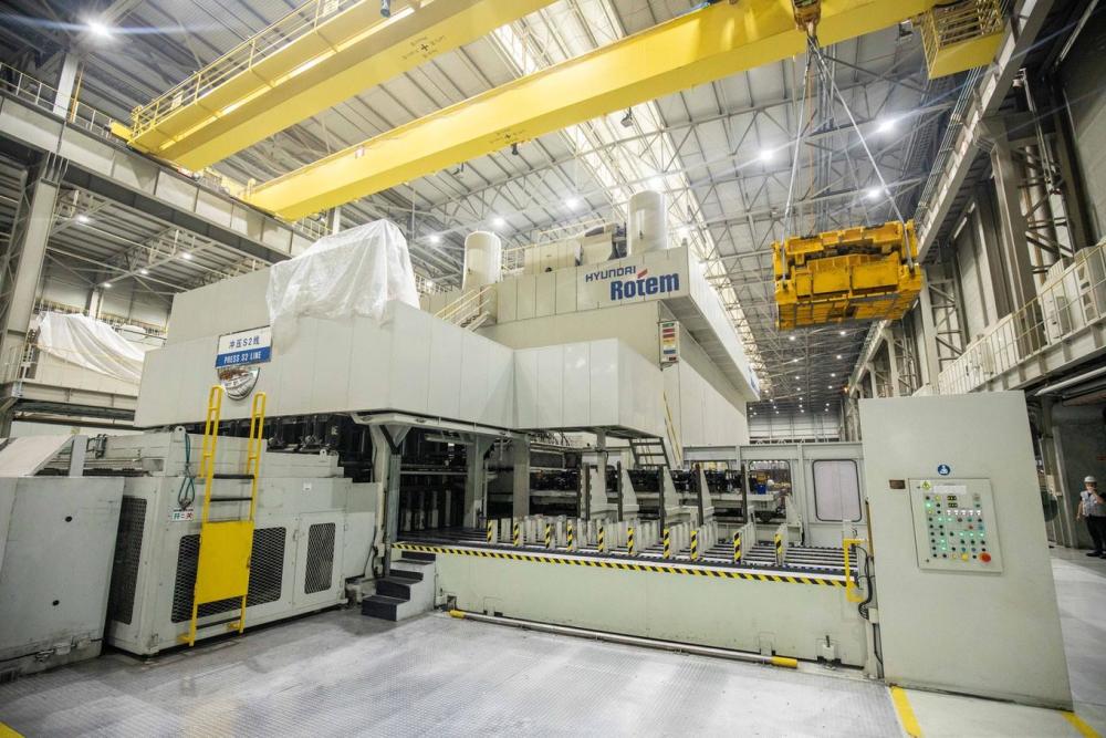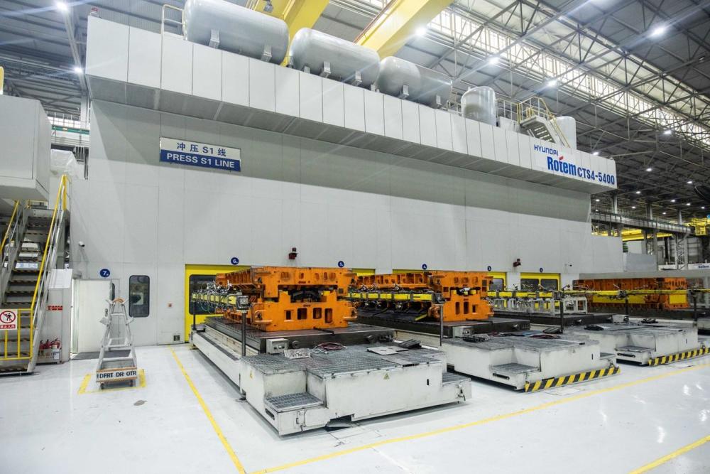 目前,北京现代杨镇工厂为5种车型,包括第七代伊兰特、新名图、新名图EV、全新悦动、第四代胜达生产板件86种。车间内可以看到S1、S2 两条冲压线,制件自动化码件系统的应用提高了生产效率。500吨位的开卷线、2400T研配压机和200T的模具翻转机、德国DEMAG大型天车等设备也成为车间先进性的代表。