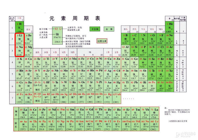 首先要明确,不管是三元锂电池还是磷酸铁锂电池,都属于锂离子电池。而钠离子电池,是将正极材料换成了钠离子聚合物。钠和锂在元素周期表上处于同一列,都是最外层只有一个电子,易失电子的活泼金属元素,二者的元素性质比较接近,因而钠离子电池的原理与锂离子电池基本一致。