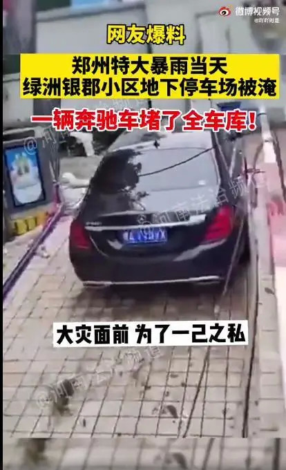 但可恶的一幕出现在郑州绿洲某郡小区地下车库,一辆奔驰车由于害怕被淹,将车停在了地下停车场的唯一出口。这样堵住出口的做法,让车库内的其他车辆无法离开车库,最终导致车库车辆全部被淹的情况发生。
