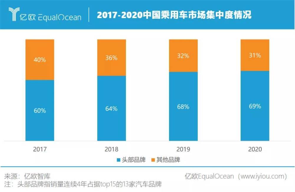 与此同时,中国汽车市场正式由增量市场向存量市场转变,所呈现的马太效应也愈发明显。据亿欧汽车观察,2020年中国乘用车市场集中度再度提升,销量连续4年占据top15的13家汽车品牌,市占率高达69%,留给剩余近百家车企的市场空间仅有31%。可以说,一场战况激烈的汽车品牌淘汰赛正在如火如荼地进行中。如何靠品牌侵占汽车用户心智?这是一道令车企绞尽脑汁的问题。