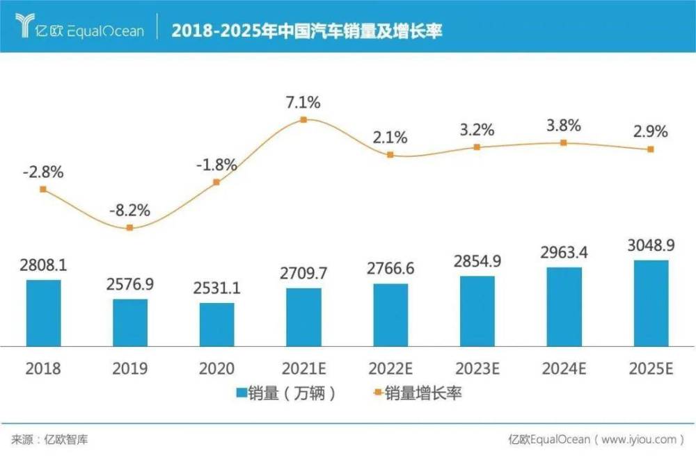 展望未来,亿欧汽车对中国汽车销量前景持乐观态度,我们认为中国汽车销量有望在2021年至2025年间保持超3%的平均增长率,并在2025年达到3050万辆左右的年销量。其中,2021年是整个行业打响销量反击战的关键一年。
