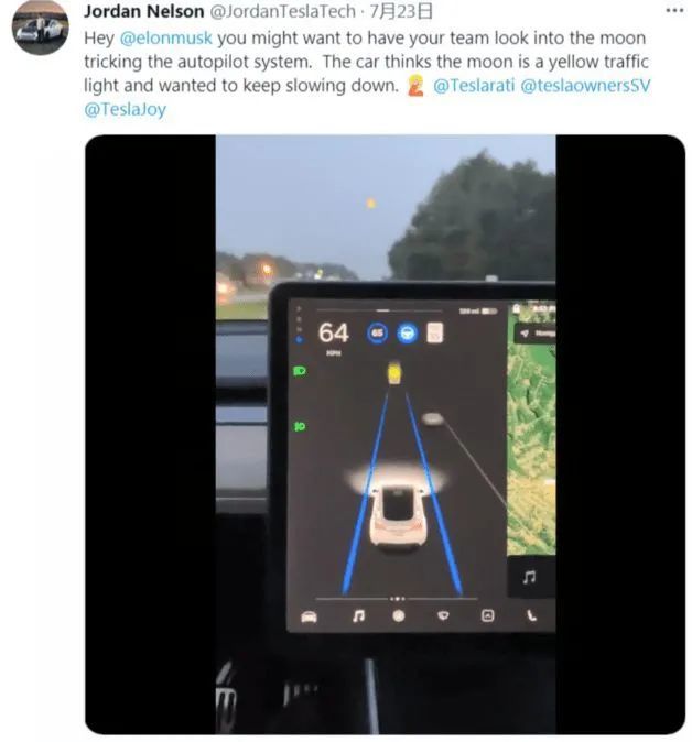 最近一位特斯拉车主Jordan Nelson在Twitter上发布了一段视频并@了ElonMusk,视频显示特斯拉FSD系统将月亮识别成了黄灯,并使在高速巡航行驶中的车辆减速。