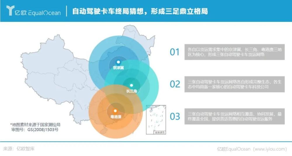 综合考虑中国区域经济发展与货运需求分布现状与趋势,亿欧智库判断,以京津冀、长三角、粤港澳三大经济发展区域为核心,将形成三张自动驾驶卡车货运网络,并各自形成完整生态。各网络生态中均具备一家核心的自动驾驶科技公司,形成三足鼎立格局。