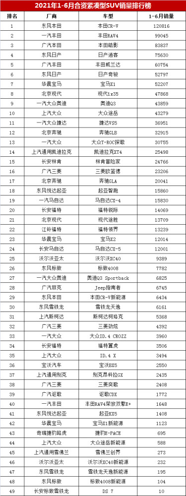 【2021年1-6月合资紧凑型SUV销量排行榜】据购车网编辑日前整理统计显示,2021年1-6月合资紧凑型SUV累计批发销量为105.0万辆,相比受疫情影响的去年同期增加了16.3万辆,同比增长18.3%,低于上半年SUV市场28.3%的涨幅。