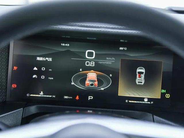 方向盘采用了三辐样式设计,三、九点位置比较粗壮,两侧的多功能按键回馈手感很棒,按键面积较大,方便操作。最低配车型全液晶仪表盘尺寸为10.25英寸;中高配车型则为12.3英寸,UI设计简洁新颖,显示效果细腻,除了可以显示常规的行驶数据、油耗信息、续航里程、胎压监测外,还可以显示车辆的俯仰角&侧倾角、海拔&气压、转向提示等信息。