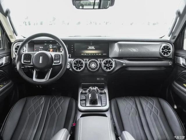 内部设计理念遵循了硬派越野的风格,大面积的方直轮廓线条搭配圆润的倒角,此外圆型空调出风口和圆形功能旋钮配以菱形缝线内饰板,搭配起来更有质感。最低配中控屏幕的尺寸为10.25英寸;中高配车型则为12.3英寸,分辨率为1920*720,显示效果出众,系统触控反应的灵敏度达到了主流水准。车机基于科大讯飞3.5系统打造而来,支持语音识别控制(多媒体、导航、电话、空调等),自带了高德地图、爱奇艺、抖音等应用,日常用车会更加方便。
