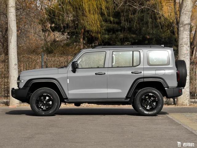 来到车身侧面,该车车侧呈现出硬朗的设计风格,配合简单的腰线,饱满的设计彰显出十足的力量感。该车长宽高为4760/1930/1927mm,轴距为2750mm,搭配了锦湖轮胎,前后轮胎规格均为265/65 R17。