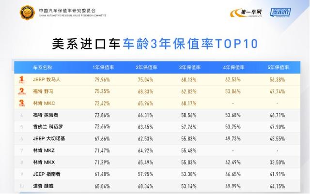 此前刚刚发布的中国汽车保值率研究委员会发布的《中国汽车保值率报告》中,Jeep牧马人在"美系进口车车龄3年保值率TOP10"榜单中,位居第一。