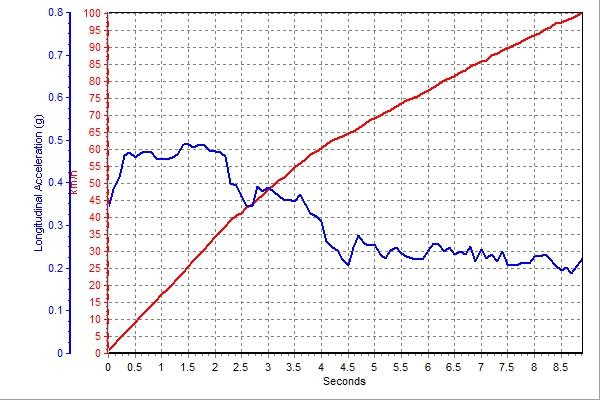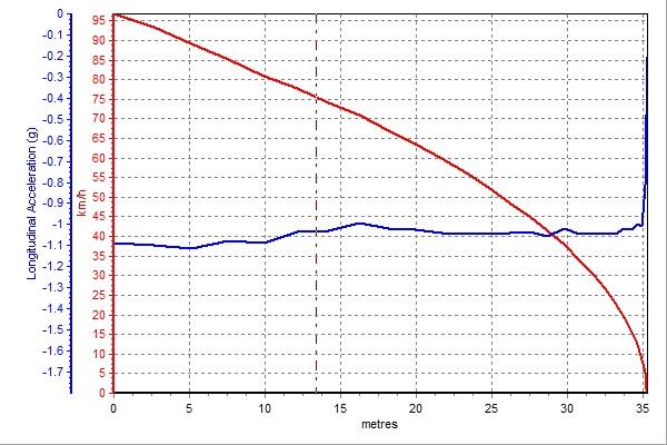 100km/h-0的刹车数据为37.58米。我翻了一下一年来的刹车测试,37.58米排在力狮、顶配宝马X1之前,非常不错。由这个成绩,可以无缝的切换到下一个数据——噪音测试。