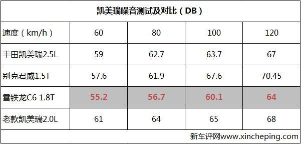 如果纵向来比,老款凯美瑞的隔音不算强,新款小幅提升,这一点从下面的数据表格就可以体现出来。横向对比,我找来了两款同级中很有代表性的车,很安静的雪铁龙C6和很吵的君威1.5T(2.0T的车型隔音会好一些)。从数值看,凯美瑞的各项成绩差不多是C6和君威的平均值,老款凯美瑞中庸的风格,在隔音上继承了下来。