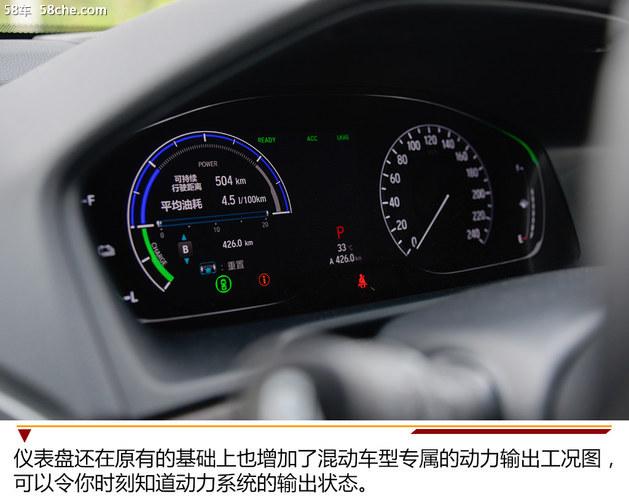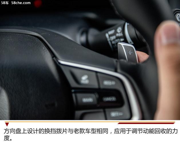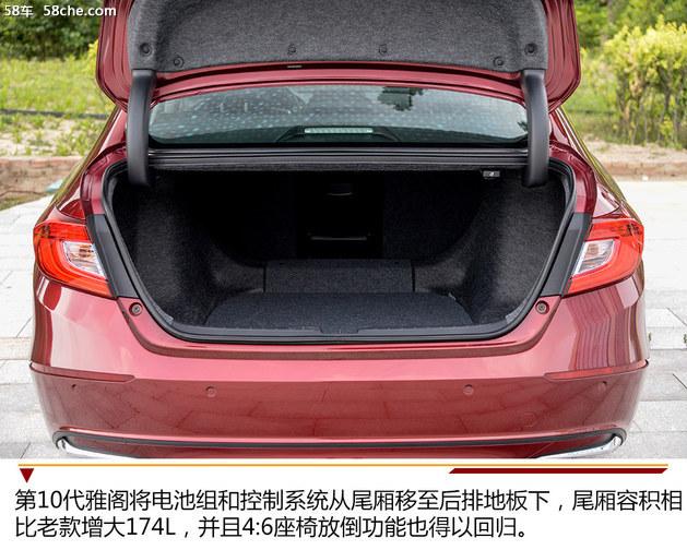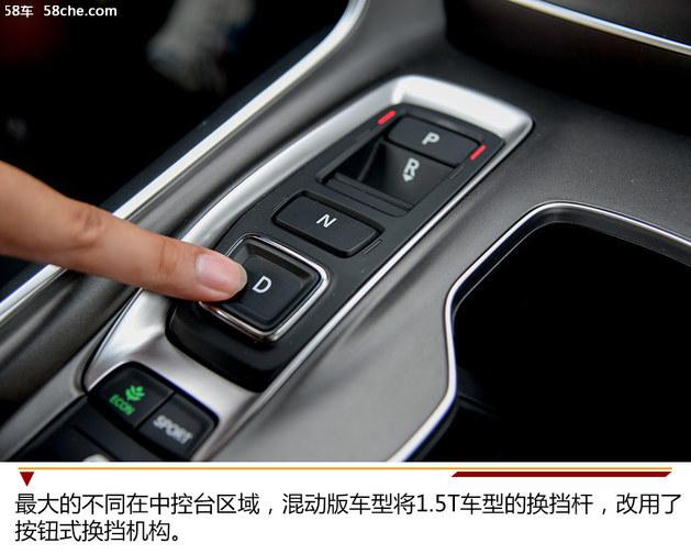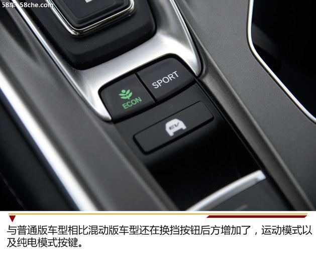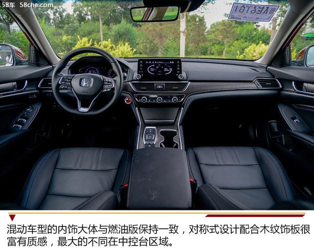 混动车型的内饰大体与燃油版保持一致,对称式设计配合木纹饰板很富有质感。最大的不同在中控台区域,混动版车型将1.5T车型的换挡杆,改用了按钮式换挡机构,与普通版车型相比混动版车型还增加了运动模式以及纯电模式。另外仪表盘也增加了混动车型专属的动力输出工况图,这套系统同样在HMI人机交互系统中也可以进行显示,方向盘上设计的换挡拨片与老款车型相同,应用于调节动能回收的力度,第10代雅阁将电池组和控制系统从尾厢移至后排地板下,尾厢容积相比老款增大174L,并且4:6座椅放倒功能也得以回归。