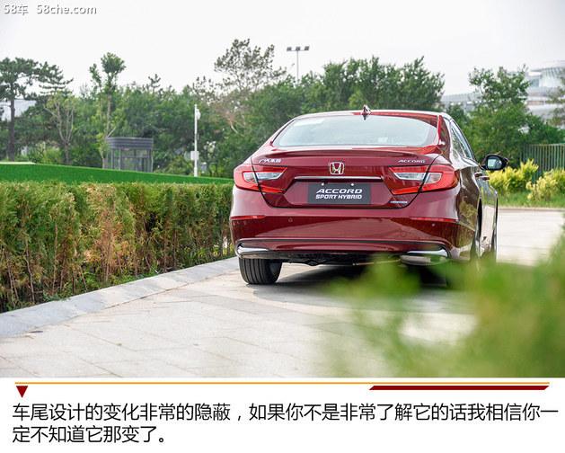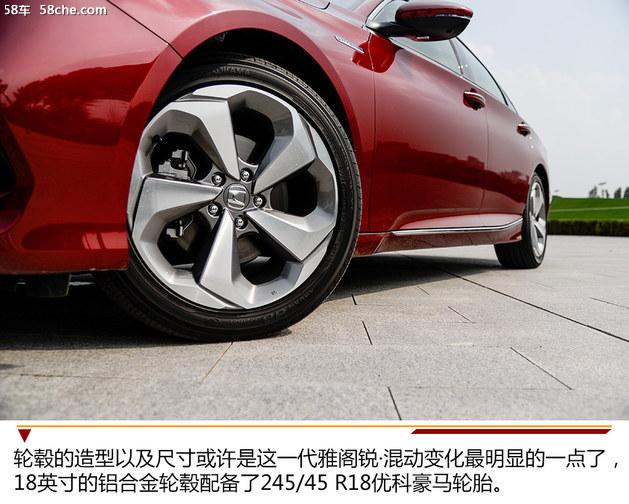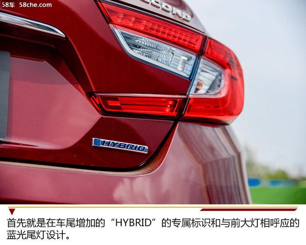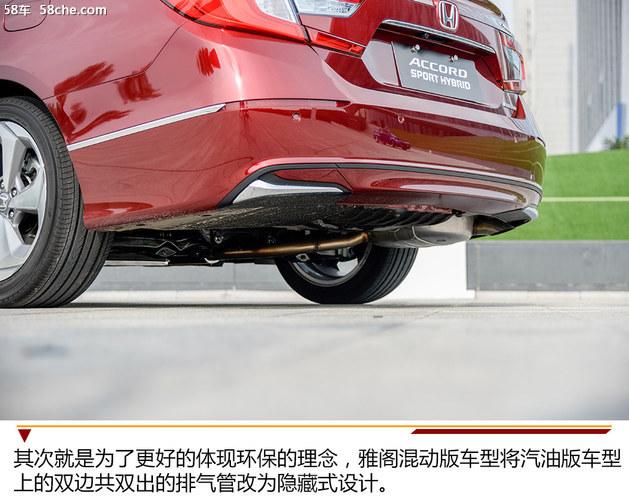 对于外观部分的介绍雅阁混动版在汽油版车型的基础上进行了一些调整,整车最明显的变化就是混动版车型使用了18英寸的轮毂,除此之外两侧的前翼子板以及车尾处还设计了“HYBRID”专属标识,前大灯以及尾灯还增加了“HYBRID”专属蓝光设计,为了更好的体现环保的理念雅阁混动版车型汽油版车型上的双边共双出的排气管改为隐藏式设计,最后一个小设计就是带有气氛灯的镀铬门把手。