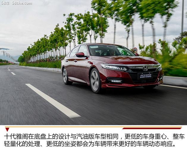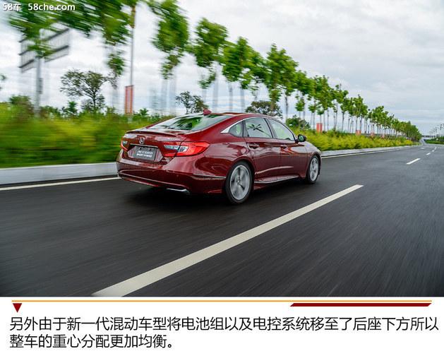 十代雅阁在底盘上的设计与汽油版车型相同,更低的车身重心、整车轻量化的处理、更低的坐姿、底盘悬架结构的优化都会为车辆带来更清晰的路感以及更好的车辆动态响应,全新雅阁的底盘刚性提升了32%,在经过颠簸路段时也没有因为车身扭曲而产生任何的异响。另外由于新一代混动车型将电池组以及电控系统移至了后座下方所以整车的中心分配更加均衡。