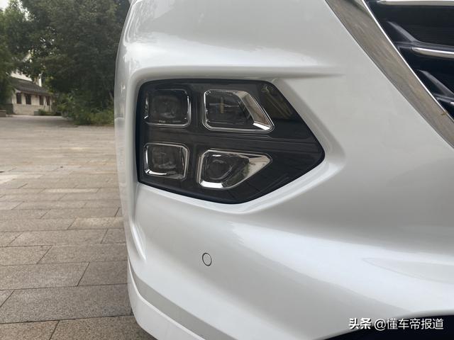 前格栅采用了横条的造型设计,并且采用了大面积的镀铬处理方式,和银色logo融为了一体。大灯采用的是分体式造型,灯组上方是狭长LED大灯,而灯组下方这里是远近光灯和雾灯。