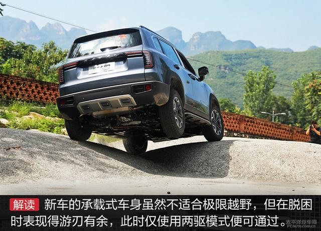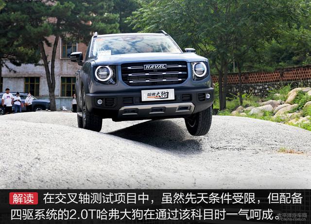 2.0T车型在轮胎配置方面有别于1.5T两驱车型,由佳通F50换装适应性更加广泛的AT胎,在颗粒较大的路面行驶时摩擦力会更加优秀。在这样的环境下,2.0T的哈弗大狗仅用两轮驱动便可以轻松通过馒头包交叉轴,虽然不主打越野,但它是具备一定越野能力的,只不过相比非承载式车身的硬派越野车来说,姿态上略显生硬而已。