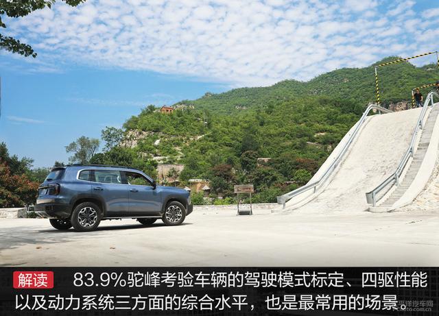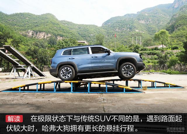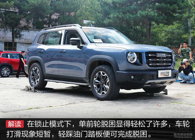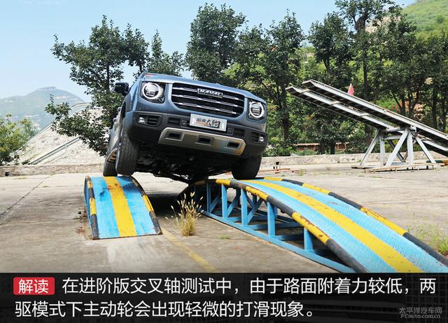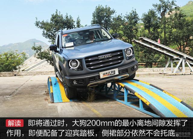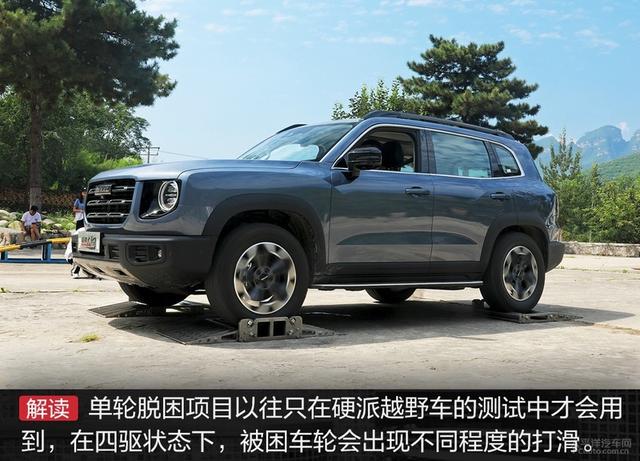 如果不是翘起的前轮,光看后轮悬挂压缩的幅度和拉伸行程时,真有些以假乱真的感觉,哈弗大狗在遇到附着力较低的馒头包时,两驱状态下也可通过,但四轮会出现不同程度的打滑现象,其实这个科目我认为1.5T的两驱版车型也完全能够胜任。