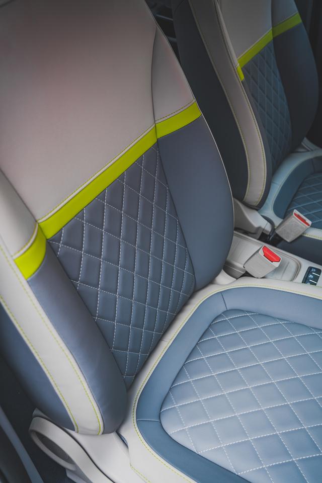 我们所试驾的这台车内饰采用的是灰色搭配绿色的配色,此外还有黑色、深灰配浅灰、灰配蓝、灰配红、黑配绿、黑配蓝、黑配红七种色彩组合,可以满足不同消费者的喜好,座椅也是采用的同样风格,双色皮革中间用绿色贯穿,同时还有菱形缝线,兼顾美感和摩擦力。