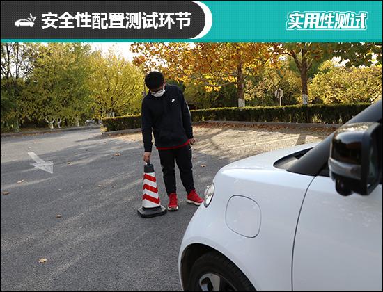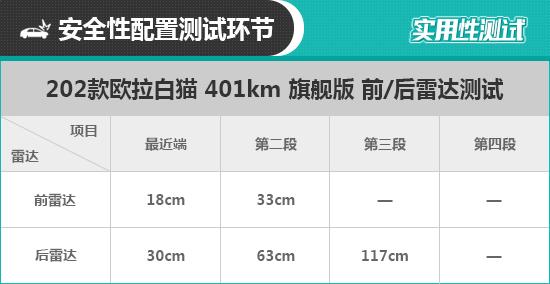 此次测试的欧拉白猫还配备了前雷达,而这项配置只出现在全系最顶配的车型上。不过从车头来看,仅在左右两侧配备了两颗雷达,通过测试也证实,由于结构原因,欧拉白猫对正前方较细的物体是无法识别的,比如测试用的桩桶。所以测试时我们将桩桶的位置进行了变更,经过测试发现,前雷达采用了两段式蜂鸣,最远可在33cm处感应到前方物体,而持续蜂鸣阶段最远距离为18cm,要略低于经验值,可见驾驶者在行驶过程中对前雷达不能过于依赖,还需要多进行观察。
