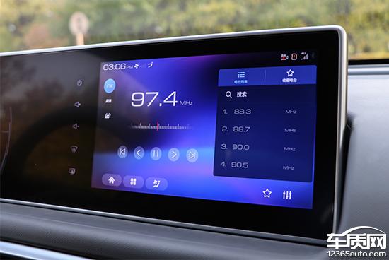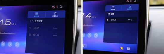 对于日常使用最多的收音机功能我们也进行了测试,首先直接点击屏幕中的“收音机”图标便可进入收音机功能界面,之后可以在右侧的列表中可以看到已经搜索出来的电台列表。点击列表上方的“搜索”,系统便会自动进行频率搜索。而想要收藏频率也很简单,只需要选好频率后将右下角的空心五星图标点击变为实心黄色,然后在收藏电台里就可以看到全部的收藏列表了。