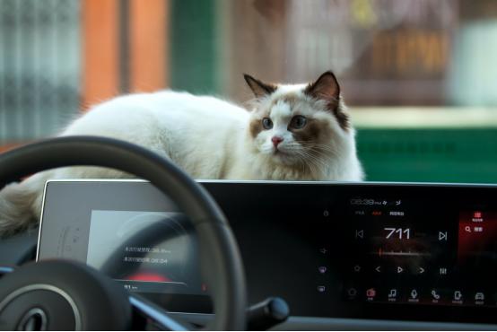 内饰部分,欧拉白猫遵循LESS IS MORE的设计理念,采用环抱式设计,撞色的装饰点缀让整个车厢活泼灵动了不少。全液晶仪表盘、全高清23英寸触控屏、一体式集成化连屏等设计,使整体内饰科技感十足。