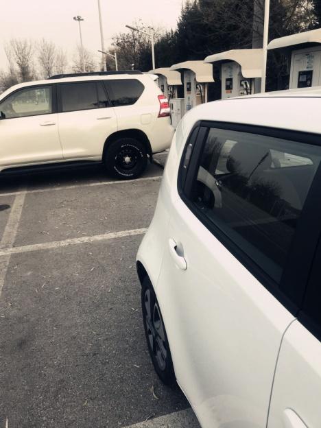 这是一台很有主见的车,司机身高只照顾矮的,但充电线就反过来,只照顾长的。白猫的快充/慢充接口分别在车两边的"腮帮子"上,有些电站偏短的电缆甚至够不到它。为了不半路老汉推车,只能趁四下无人,横着怼进车位,给腮帮子戳上。的确是魔法汽车。