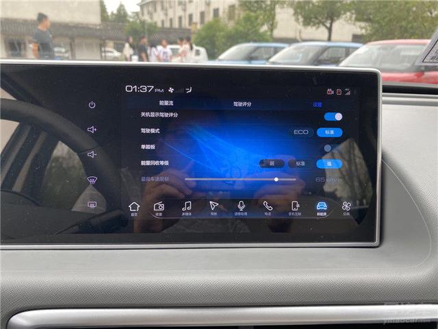 当然,它的联屏并非好看这么简单,整体显示效果十分细腻。功能方面虽没有太多噱头,但基本的实用性配置均没有缺席,比如导航、音乐等等。同时通过屏幕中的新能源选项,还能查看平均能耗等信息,右侧的设置中还能选择驾驶模式、能量回收等操作。语音识别控制也没有缺席,点击方向盘右侧的语音按钮或者通过语音均可唤醒,并且反应速度非常快,准确率也很高。