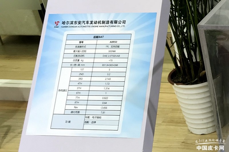 目前国内皮卡上采用的8AT变速箱大多是来自采埃孚的,而东安动力在上海车展上也展出了一台代号为A8R50的后驱8AT变速箱,这台变速箱搭配前置后驱发动机,并且支持四驱模式,最大输入扭矩达到500N·m,可以与前面介绍的D系列发动机匹配。除此以外,这款变速箱还可以搭配电子换挡和自动启停功能,或许也会是中兴皮卡主打高端市场中的一款选择。
