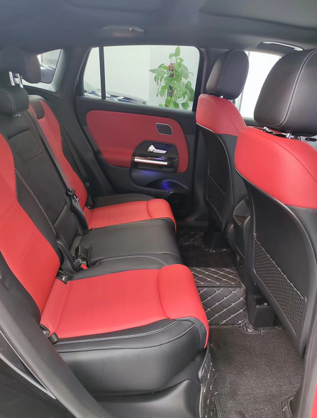 这辆车子的内饰设计相当的运动化,但是我个人不太能接受它这套红加黑色的双拼色座椅,有点汽配城的风格,但这确实是原厂设计出来的。而且座椅还是仿皮材质的,各位小伙伴们也没想到吧,中控部分搭载了奔驰家族式的双联屏设计,配备上AMG的专属运动方向盘以及运动风格的座椅,运动感,豪华感打造的确实是比较出色的。此外,车内还搭载了64种车内氛围灯,我个人是比较喜欢奔驰内饰氛围灯的。在它的竞争对手中,它的氛围灯是最为出色的,特别是眼前这款氛围灯,发出紫蓝色的光,看起来温馨且高档。