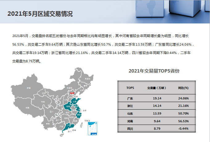 从结果来看,随着各地取消限迁政策的落地,部分地区二手车消费潜力也被有效激活。以较早取消二手车限迁的山东、河南省为例,中国汽车流通协会数据显示,2021年5月,河南省较去年同期增长最为明显,二手车交易量同比增长56.53%,共交易二手车约9.64万辆;其次是山东省,二手车交易量同比增长50.7%,共交易二手车约13.59万辆。