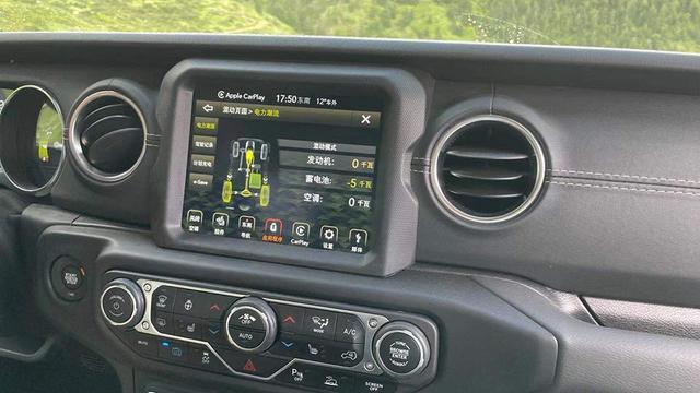 副驾前方依旧是扶手的设计,虽然不好看,但是确实在实际越野的颠簸中,在我乘坐在副驾驶位的时候,越野路段的坑洼颠簸确实让我感受到它的实用性,我基本上需要紧紧的抓住它来固定自己不要剧烈的晃动。与传统燃油版的区别最大的是在方向盘左边的区域设置了动力模式切换的按钮,在驾驶中我尝试了通过目前的驾驶情况选择纯电,混动或者燃油来对车辆进行驱动,在选择燃油驱动的时候,发动机会给蓄电池进行充电。另外就是在仪表盘上,也会多了对电量的显示功能。中控屏幕也可通过物理按键实现对动能回收情况的实时监控,我认为这样的设定非常的一目了然。