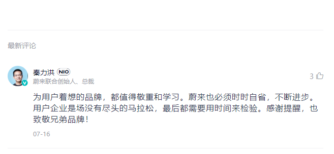 值得一提的是,有网友将岚图的这一波操作发在了网上,而岚图汽车的举动不仅受到了诸多网友好评,也吸引了同为“用户型企业”的蔚来老总秦力洪先生的关注,秦力洪还给出了“值得敬重和学习”的肯定评价,并且还站在蔚来汽车的角度表示“蔚来也必须时时自省,不断进步,从而紧抓消费者的真实需求”。