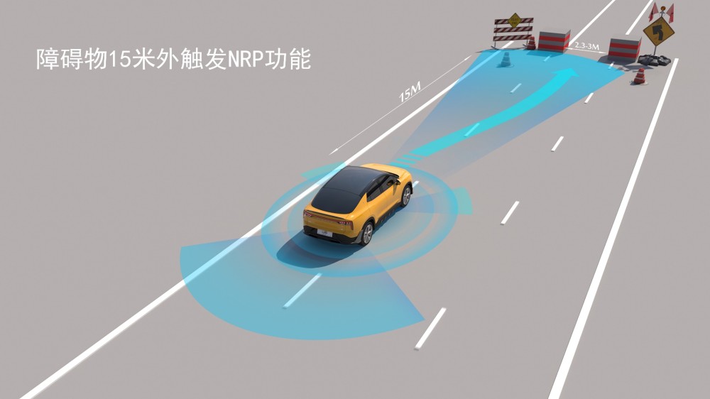 在爱驰U6搭载的AI-Cruise智能驾驶系统中,除去VRP视距内泊车功能之外,更有其余的26项智驾功能。在诸多功能之中,不得不提及的,是爱驰首创的NRP窄路通行辅助,该功能针对的场景为安装布置有限宽桩、雪糕筒等限宽设施的窄路或类似场景狭窄道路。