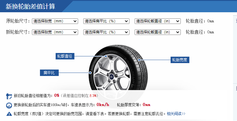 当然,聪明人又怎么会傻乎乎地慢慢去计算轮胎直径。网上多的是各式各样的轮胎计算器,只要输入原厂轮胎的尺寸,然后根据你的需求选择新轮胎的尺寸,系统就会自动帮你计算新旧轮胎的直径差、更换轮胎之后时速表的变化以及轮胎侧壁的厚度变化。