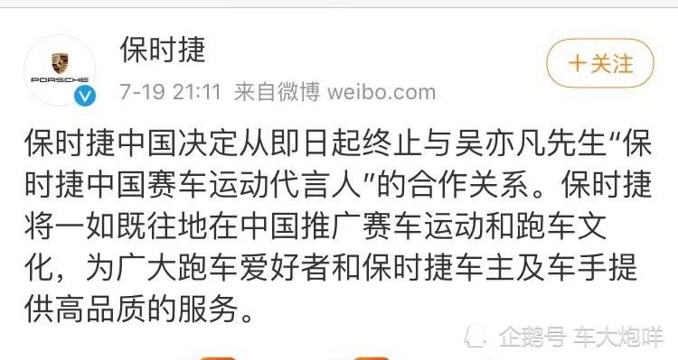 7月19日晚间,保时捷通过官方社交平台账号正式宣布,从即日起终止与吴亦凡“保时捷中国赛车运动代言人”的合作关系,并表示将一如既往地在中国推广赛车运动和跑车文化,为广大跑车爱好者和保时捷车主及车手提供高品质的服务。值得注意的是,保时捷在声明中用的是“终止”而不是“中止”,体现出官方对于此次事件的立场。
