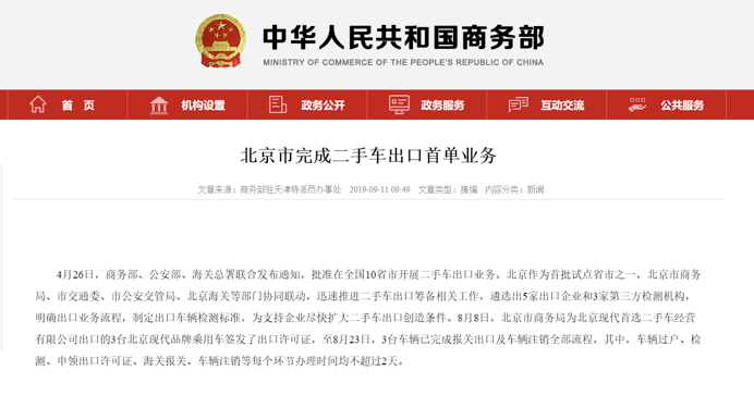 2019年9月,在北京市二手车出口试点企业调研会上获商务部外贸司高度评价