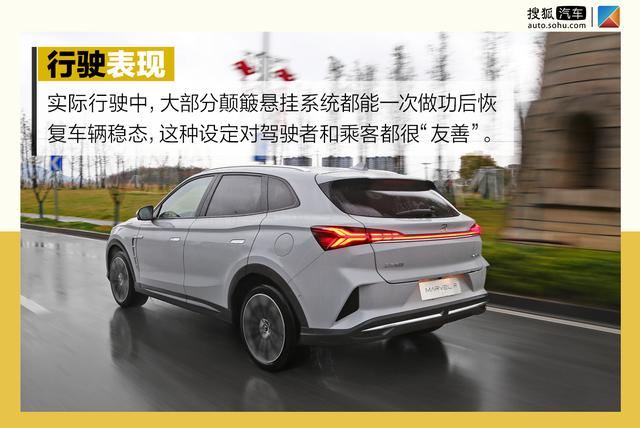 底盘的“韧”则是笔者个人较为喜欢的风格。在没有配备空气悬挂这个降低纯电动车底盘调校难度的车型中,MARVEL R的表现可圈可点。因动力电池更大的自重,MARVEL R悬挂的主观感受自然是要比同级别燃油车要硬,却也没有Model 3那么极致,弹簧系数和避震阻尼都比较合适,且二者之间的匹配上佳。