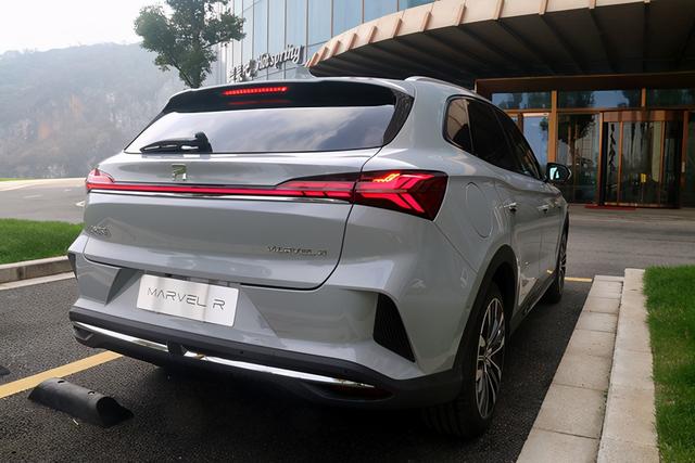由于车顶尾部下层设计和超宽的车身,MARVEL R的尾部看起来非常饱满。箭翎贯穿尾灯如两支箭连起来一样,指向性的设计将焦点引向中间R品牌的LOGO。除了贯穿式尾灯外,在尾灯的下方还有一条非常细的镀铬装饰条,提升了整体的质感。
