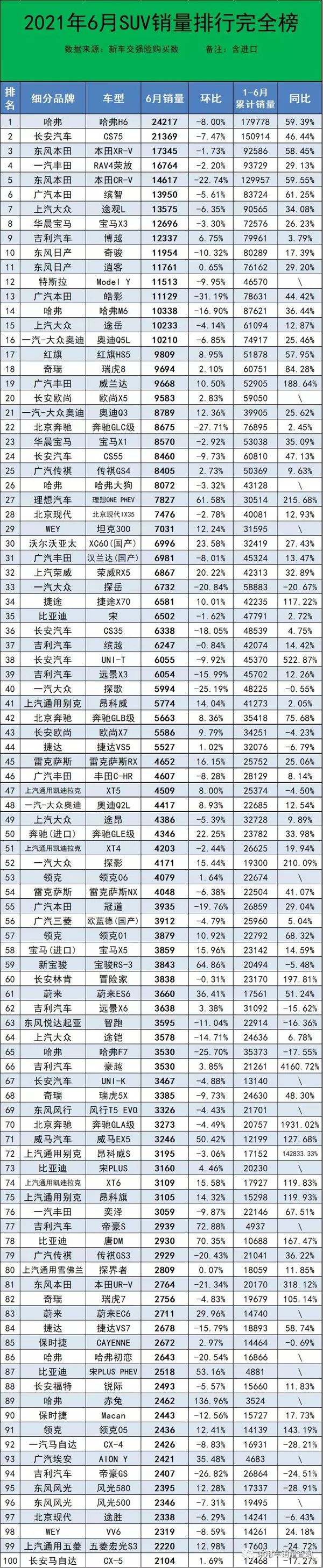 车矩阵车评:近日基于新车交强险购买数而来的2021年6月国内乘用车销量排行榜完整版新鲜出炉,数据显示2021年6月国内乘用车销量为169.8万辆,环比增长0.15%,同比增长约3.04%,1-6月累计销售1046.9万辆。其中国内SUV销量76.6万辆,占比为45.11%,环比下降约2.54%。