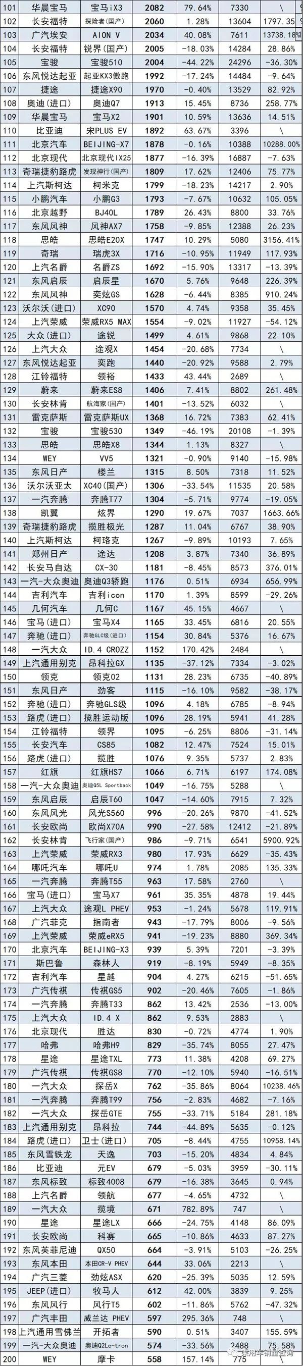 当月销量中,国产“两强”哈弗H6/长安CS75均突破2万辆销量大关,吉利博越有点吃紧,下滑比较明显;小型SUV上升较快,本田XR-V/缤智已完全领先长安CS35/大众探影等车型;一汽丰田RAV4荣放总算有了超越东风本田CR-V的记录;上汽大众途观L发挥稳定,向上突破尚有难度;面临换代的东风日产奇骏/逍客仍然有着旺盛的生命力,口碑及销量仍然不错;中型SUV领域一度销量排名靠前的一汽大众探岳由于性价比较低,早已跌落至20名开外;广汽本田皓影已成功“替代”本田冠道,曾一度被看好的冠道彻底“抬不起头”来;豪华品牌阵营中,宝马X3本月领先新款上市的奥迪Q5L和奔驰GLC;国产阵营表现出色的红旗HS5以及瑞虎8、欧尚X5等车型均接近万辆销售大关;“慢热型”的广汽丰田威兰达本月增幅明显;国产另外两款车型传祺GS4/荣威RX5表现不甚理想;长安网红车型UNI-T回归平凡,消费者理性消费渐成趋势。